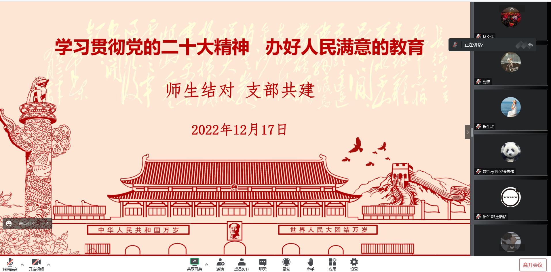12月17日晚,学院机关党支部与华为“智能基座”产教协同育人研究生党支部、余区20级专硕研究生党支部、马区21级学硕研究生党支部、本科生计算机科学与技术专业第二党支部、本科生软件工程卓越工程师专业第一党支部等5个学生党支部在线上开展了主题为“学习贯彻党的二十大精神 办好人民满意的教育”的“师生结对·支部共建”活动。活动由学院机关党支部书记章欢主持。