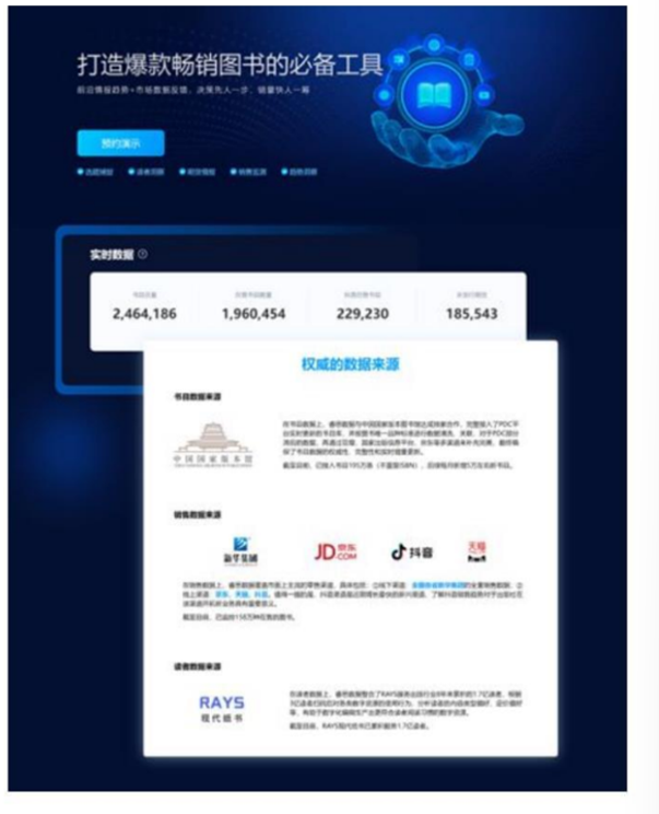 一、提供数据洞察和决策支持。当前,传统出版行业存在多元化市场需求难以捕捉、数据利用分析能力不足等问题,公司通过深入整合出版图书产业链上下游不同渠道的数据资源,打造了RAYS数据平台,为出版单位提供数据洞察和决策支持,助力其更好地把握市场趋势和用户需求,推动出版业数字化转型与创新发展。